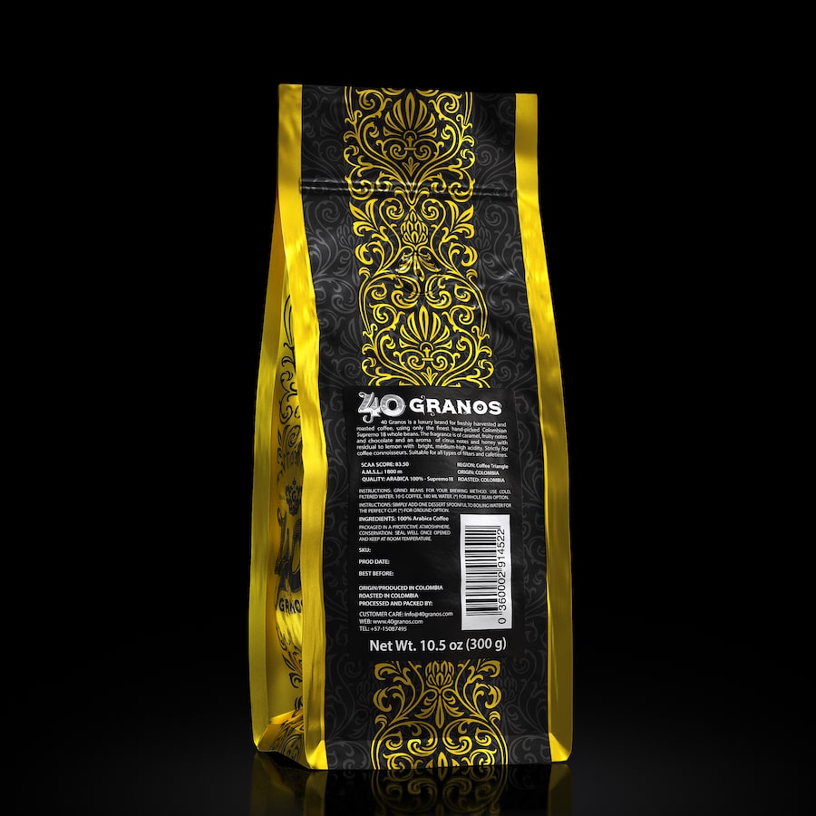 We are a Colombian Coffee company and this is our Colombian high-end brand for the highest-quality Colombian beans existent. This special coffee is available in two sizes. We sell soley wholesale and our clientele is international from all points of the world. This luxury coffee brand was created for a distinct and select clientele, who enjoys heavily charged artwork, the highest-quality-possible coffee beans and who is ready to pay the extra to have a direct from farm, 100% pure Colombian Coffee. They kind that hardly exist anymore.
